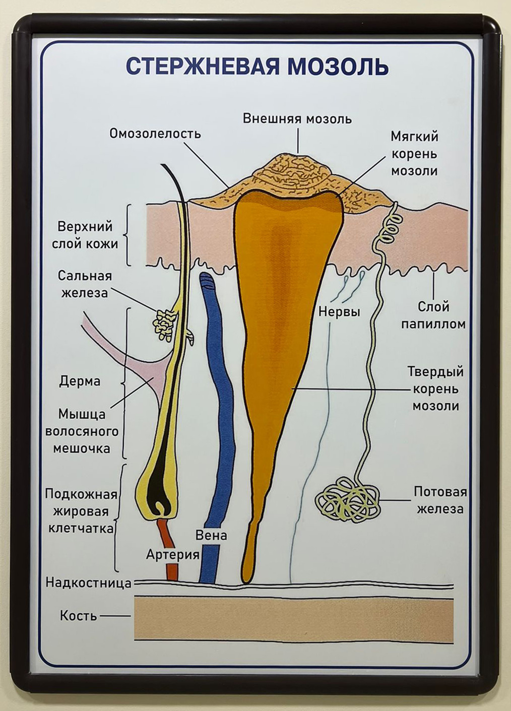 Мозоль — это утолщение верхних слоёв эпидермиса, которое возникает как ответ организма на многократное трение или давление. В основе её формирования лежит совокупность процессов, происходящих в коже, когда клеточные механизмы стимулируются усиленным внешним воздействием.