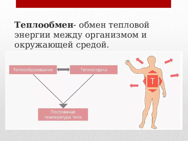 Особые терморецепторы, расположенные в коже и внутри организма, непрерывно передают информацию о текущей температуре в гипоталамус. В зависимости от полученных данных гипоталамус активирует механизмы охлаждения или нагрева.